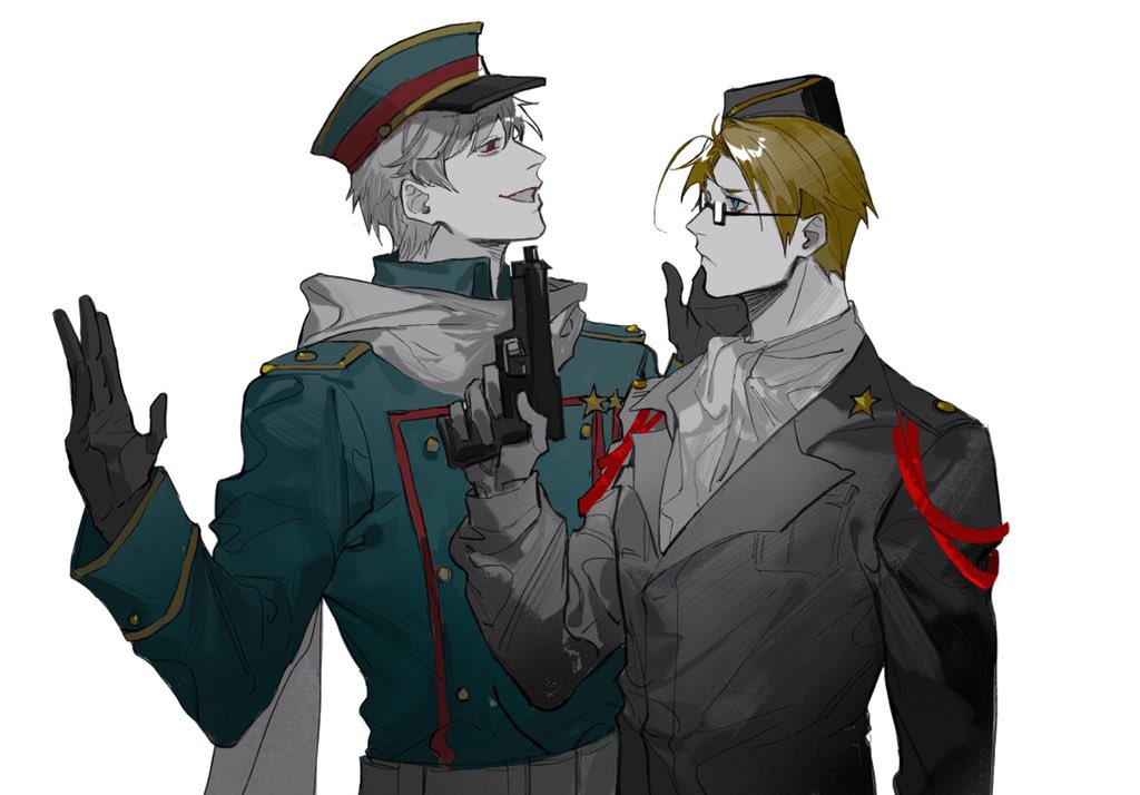 2boysahogeaiguilletteaimingascotbeltblack glovesblack hatblack jacketblack-framed eyewearblonde hairblue eyesbreast pocketbuttonsclosed mouthcollared jacketempty eyesglassesglovesgreen hatgreen jacketgrey beltgrey glovesgrey hairgunhair between eyeshand uphandgunhands uphatholdingholding gunholding weaponjacketlapelslong sleeveslooking at anothermale focusmedalmilitarymilitary hatmilitary jacketmilitary uniformmultiple boysopen mouthpeaked cappocketpuffy long sleevespuffy sleevesred eyesscarfsemi-rimless eyewearshirtshort hairsimple backgroundsmilesoviet armystar (symbol)star ornamentstar printupper bodyweaponwhite ascotwhite backgroundwhite scarfwhite shirt