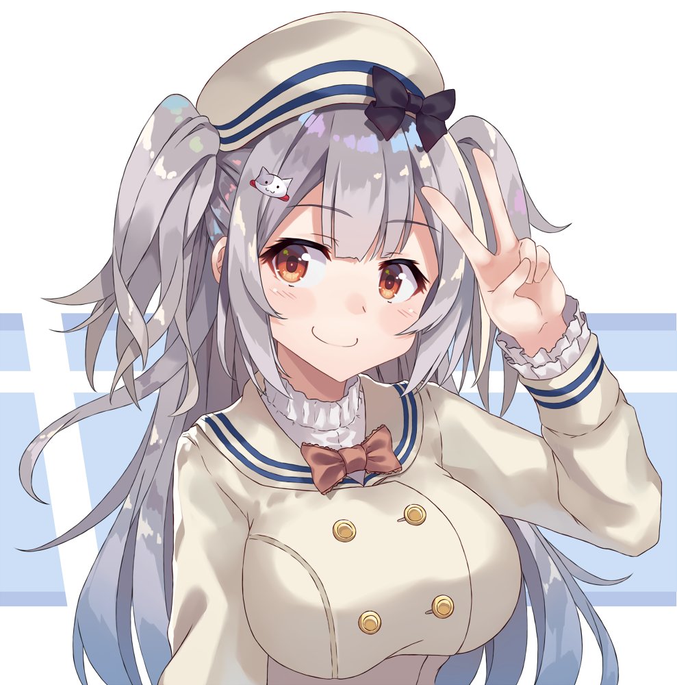 1girlberetblack bowblush stickersbowbreastsbrown bowbuttonsc:center-flap bangsclosed mouthdouble-breasteddouble-parted bangsfrilled sleevesfrillsgrey hairhair ornamenthaircliphand uphathat bowlarge breastslong hairlong sleeveslooking at viewerorange eyesshirtsmilesolotwo side upupper bodyvwhite backgroundyellow hatyellow shirt