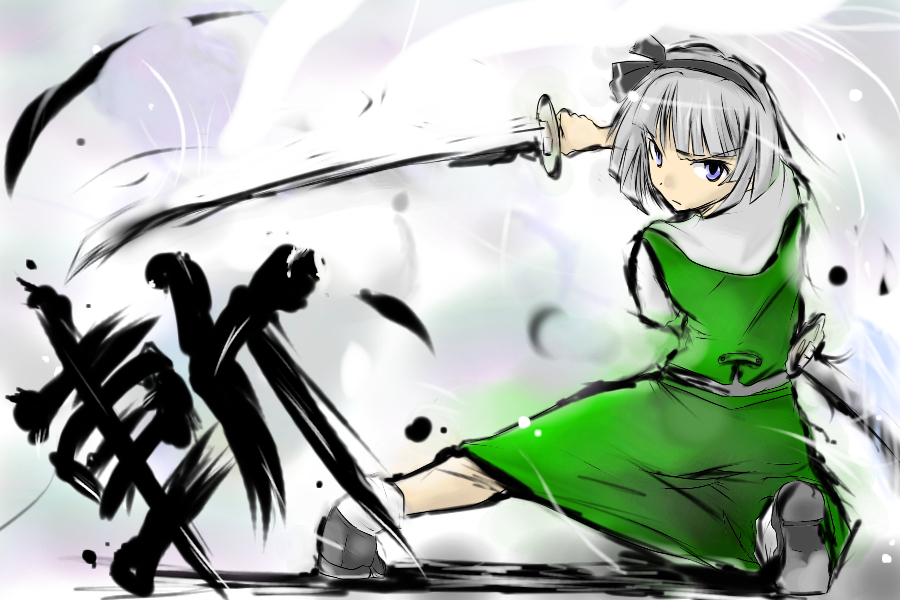 1girlblue eyesdual wieldingfemale focushair ribbonhitodamaholdingkatanaribbonshort hairsoloswordtantoweapon