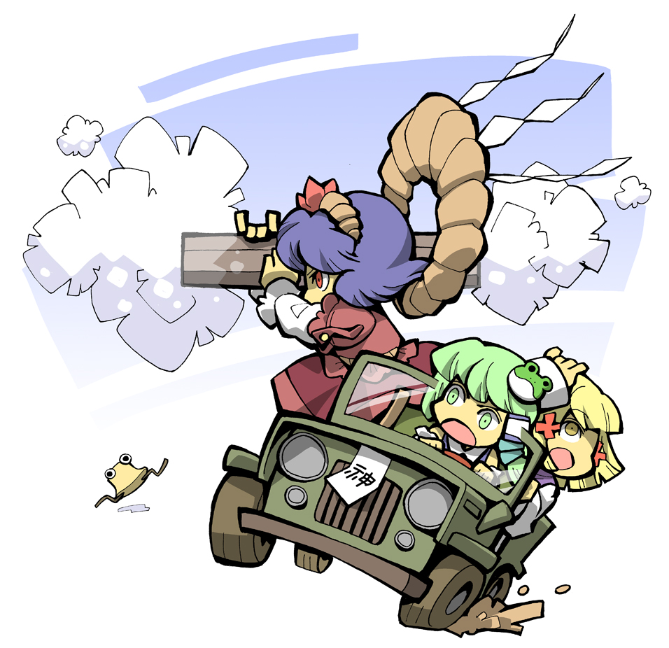 3girlsblonde haircarfemale focusgreen eyesgreen hairhair ornamenthatleafleaf hair ornamentleft-hand drivemilitary jeepmotor vehiclemultiple girlsonbashiraparodypurple hairred eyesropeshideshimenawaunworn hatunworn headwearvehicle focusyellow eyes
