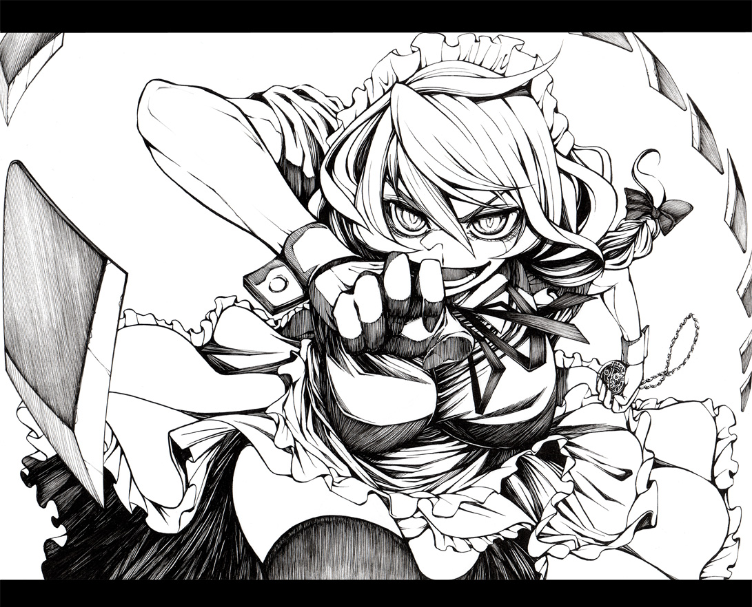 miri (cherryjelly), reze (chainsaw man), chainsaw man, highres, 1girl, apron, black choker, black ribbon, choker, grenade pin, hair between eyes, hair bun, neck ribbon, pull cord, ribbon, shirt, single hair bun, skirt, sleeveless, sleeveless shirt, speech bubble