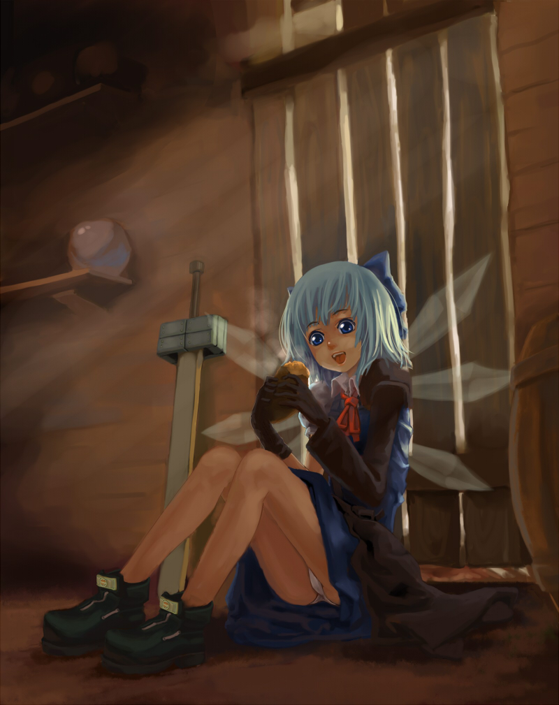 1girlblue eyesblue haireatingfemale focusfoodmatching hair/eyespantiespantyshotribbonshort hairsittingsmilesolosweet potatounderwearwings