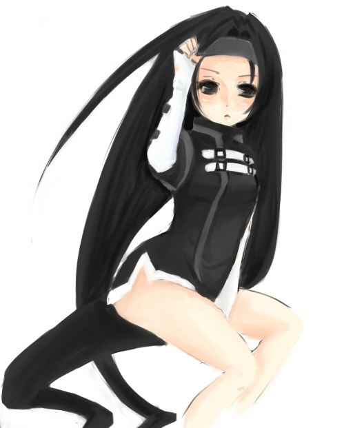 1girlalternate colorblack eyesblack hairfemale focuslong hairsimple backgroundsittingsolowhite background