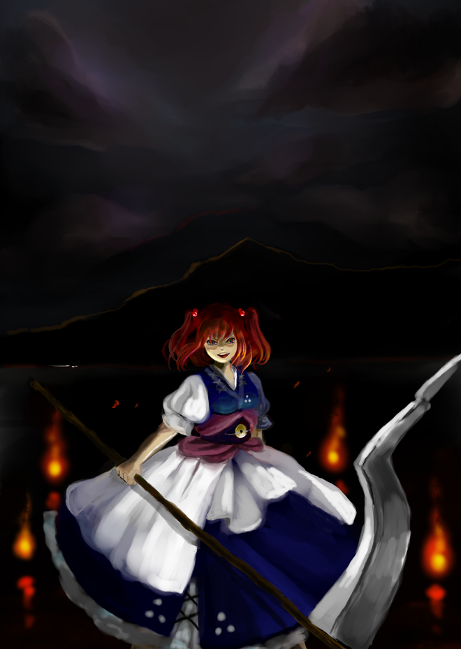 1girlblack backgroundcloudfemale focusoutdoorsred hairscytheskysolostandingtwintailstwo side up