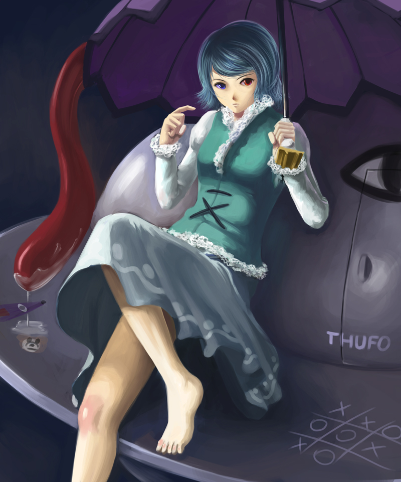 1girlbarefootblue hairfeetfemale focusheterochromiakarakasa obakesalivasittingsolotongueufoumbrella