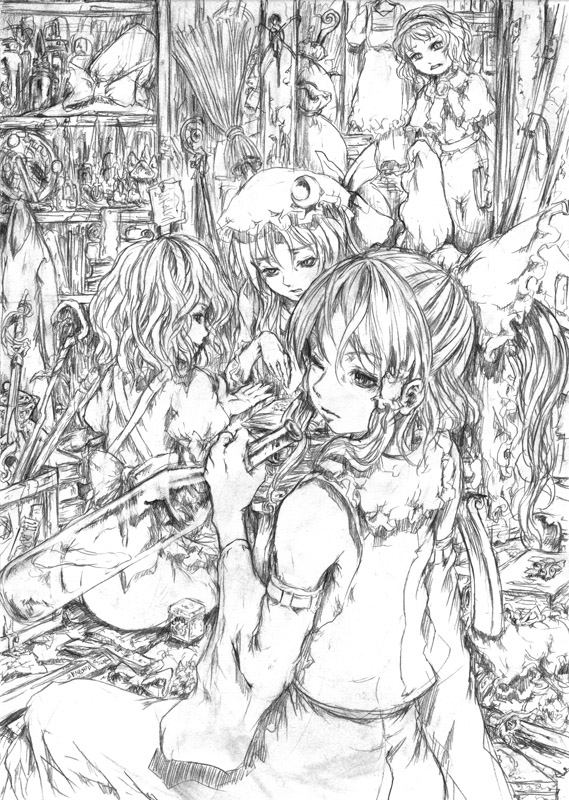 4girlsbookbottlebroomdetached sleevesfemale focusgreyscalehatjapanese clothesmikomonochromemultiple girlssketchwitchwitch hat