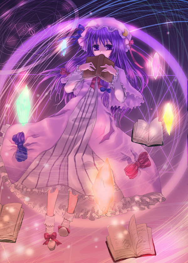 1girlbookbowcrystalfemale focushatlong hairmagic circlepink bowpurple eyespurple hairribbonsolo