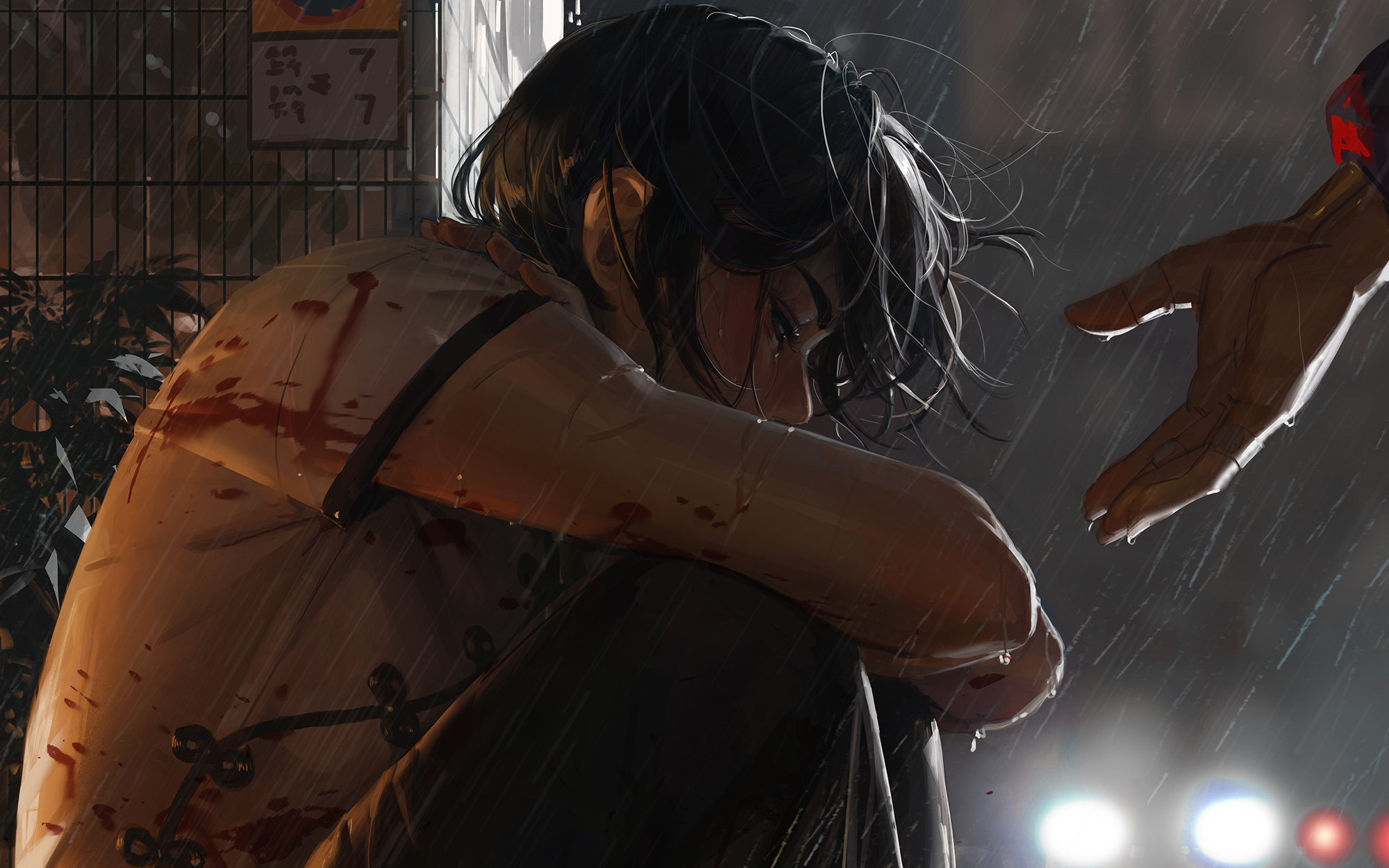 2girlsblack hairblack pantsbloodblood on clothesblurryblurry backgroundchinese clothesdepth of fieldknees uplong sleevesmultiple girlsnightoutdoorspantspuffy long sleevespuffy sleevesrainshirtshort sleevessittingwetwhite shirt