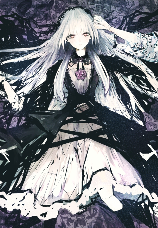 1girlblack collarblack dressblack hairbandblack socksclosed mouthcollarcowboy shotcross-laced clothescross-laced dressdetached collardoll jointsdressexpressionlesshairbandjointslayered dresslolita fashionlong hairlooking at viewerorange eyessidelockssockssolowhite dress