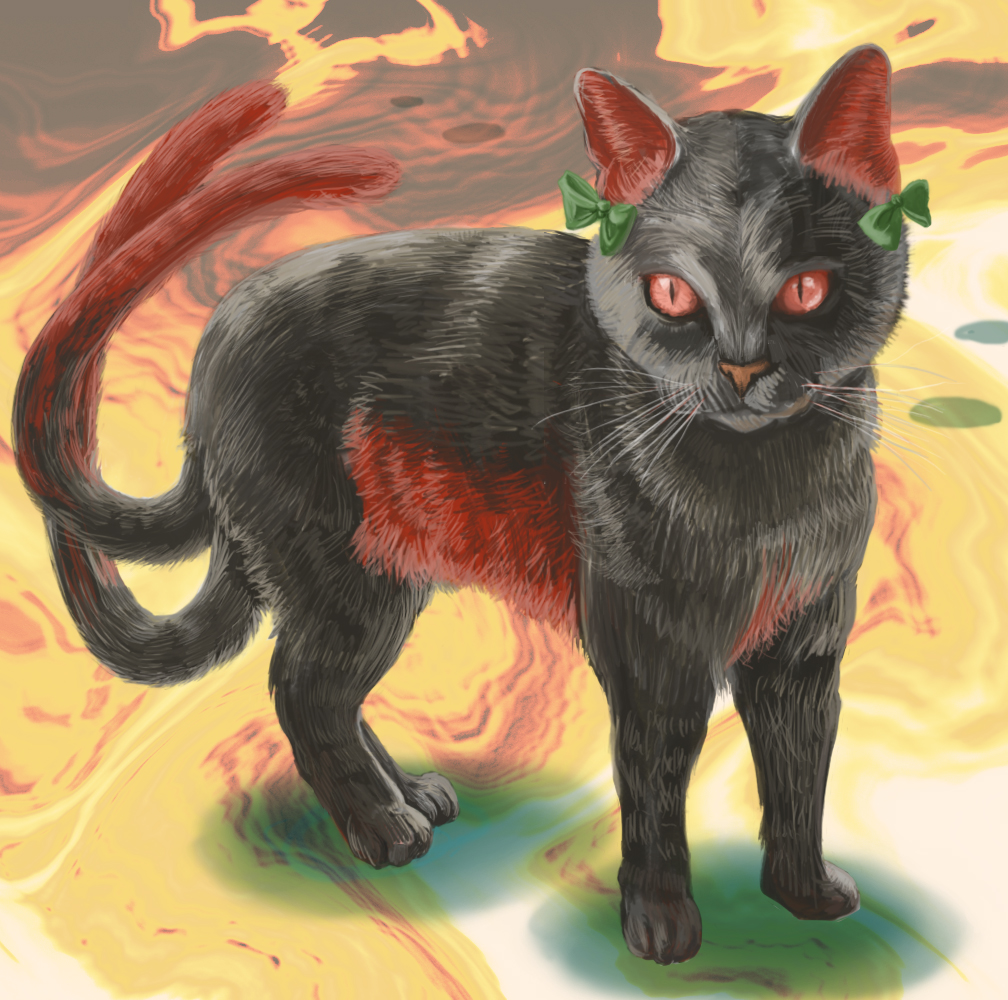 all foursanimal focusblack haircatfemale focusfull bodymultiple tailsrealisticred eyesred hairribbonsolotail