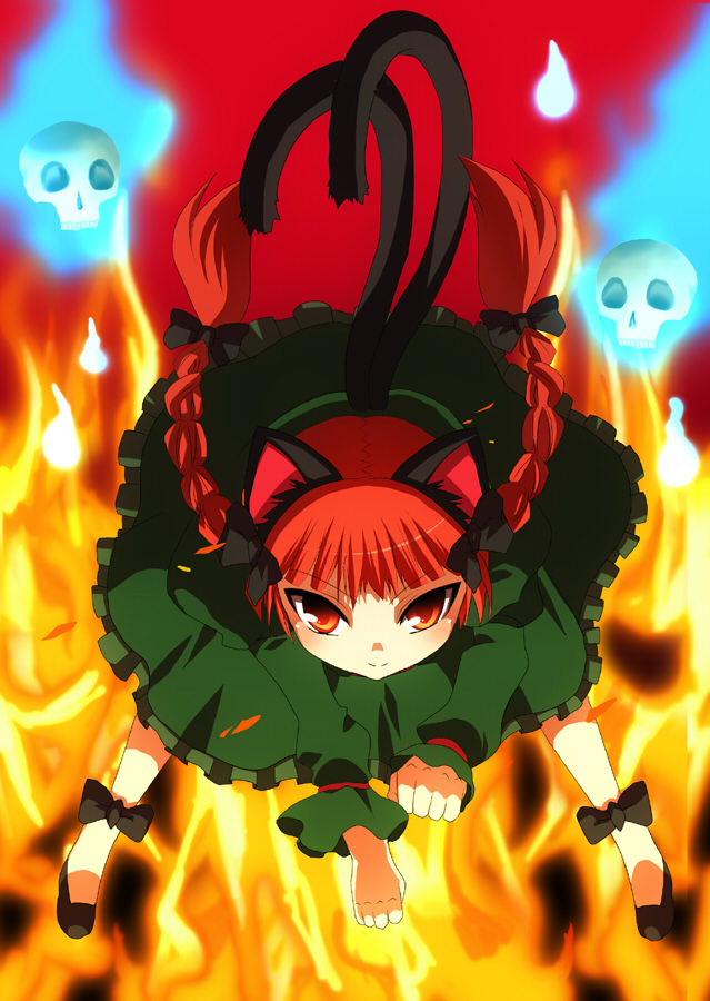 1girlall foursanimal earsbraidcat earscat girlcat tailfemale focusfirefull bodyhair ribbonmultiple tailsred eyesred hairribbonshort hairskullsolotailtwin braidstwintails