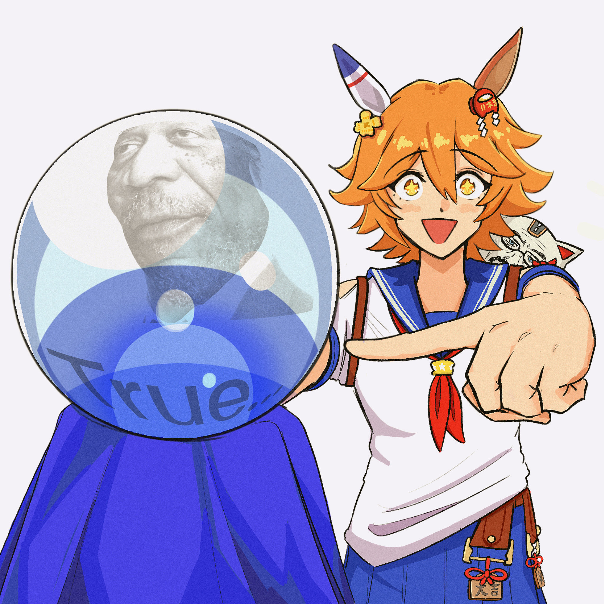 1girlblue sailor collarblushcrystal ballenglish textlooking at viewermemeneckerchiefopen mouthorange hairpleated skirtpointingpointing at objectred neckerchiefsailor collarschool uniformserafukushort hairskirtsmilesolosparkling eyessymbol-shaped pupilstrue... (meme)