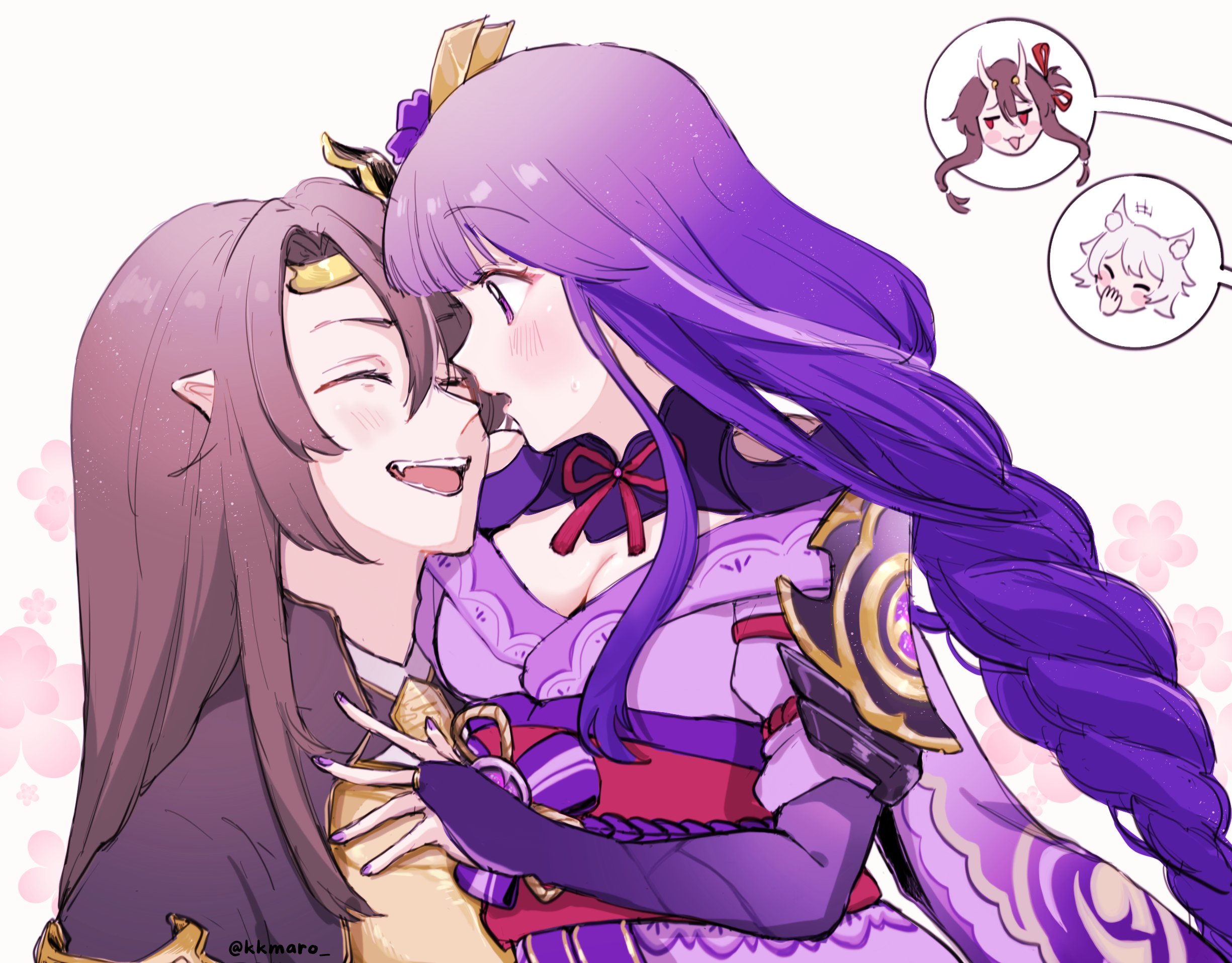1boy3girlsarmorblack hairblunt bangsblushbraidbreastsbridal gauntletsbrown haircleavageclosed eyescoupleeyelinerfangsfox girlfriendsfrom sidegirl on tophair between eyeshair ornamentheadpieceheterohornsjapanese clotheslarge breastslaughingleaning on personleaning to the sidelight blushlong braidlong hairlooking downmakeupmitsudomoe (shape)multicolored hairmultiple girlsopen mouthpointy earspurple eyespurple hairred eyelinerred eyesshoulder armorshysingle braidsittingsitting on personspoken characterstreaked hairsweatdropteasingteethtomoe (symbol)upper bodyupper teeth onlywhite backgroundwhite hair