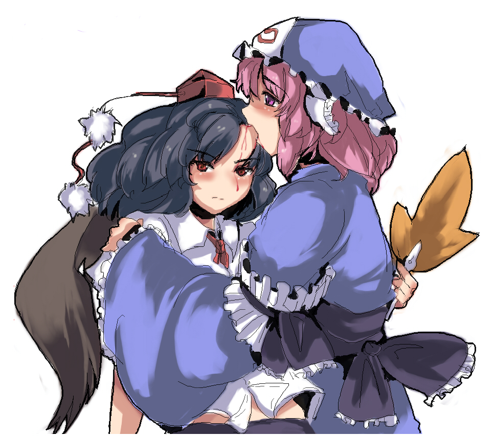 2girlsalternate hairstylebitingblack hairbloodblushdress shirteatingfemale focushand fanhatjapanese clotheskimonomultiple girlsno nosepink eyespink hairred eyesshirtshort hairsimple backgroundtokin hatuntuckedwings