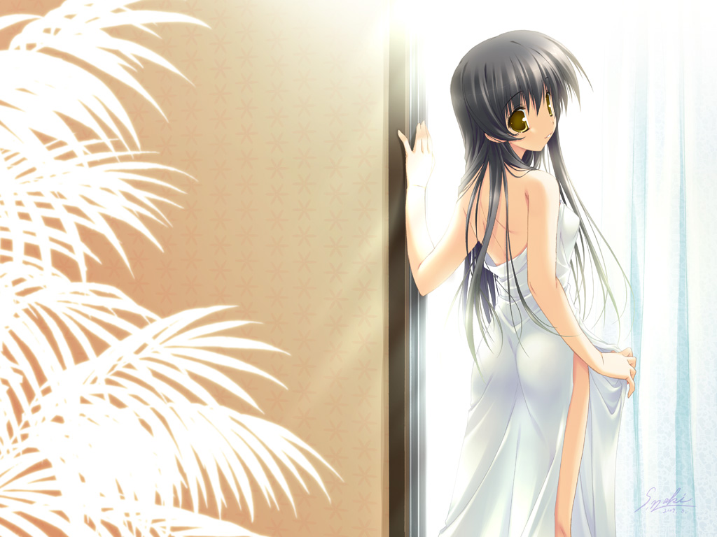 ko~cha, shikimori ibuki, happiness!, game cg, 00s, 1girl, bed, blush, bow, bow panties, female focus, flat chest, lingerie, long hair, lying, nightgown, on side, panties, pillow, pink panties, red eyes, see-through clothes, solo, underwear, white hair