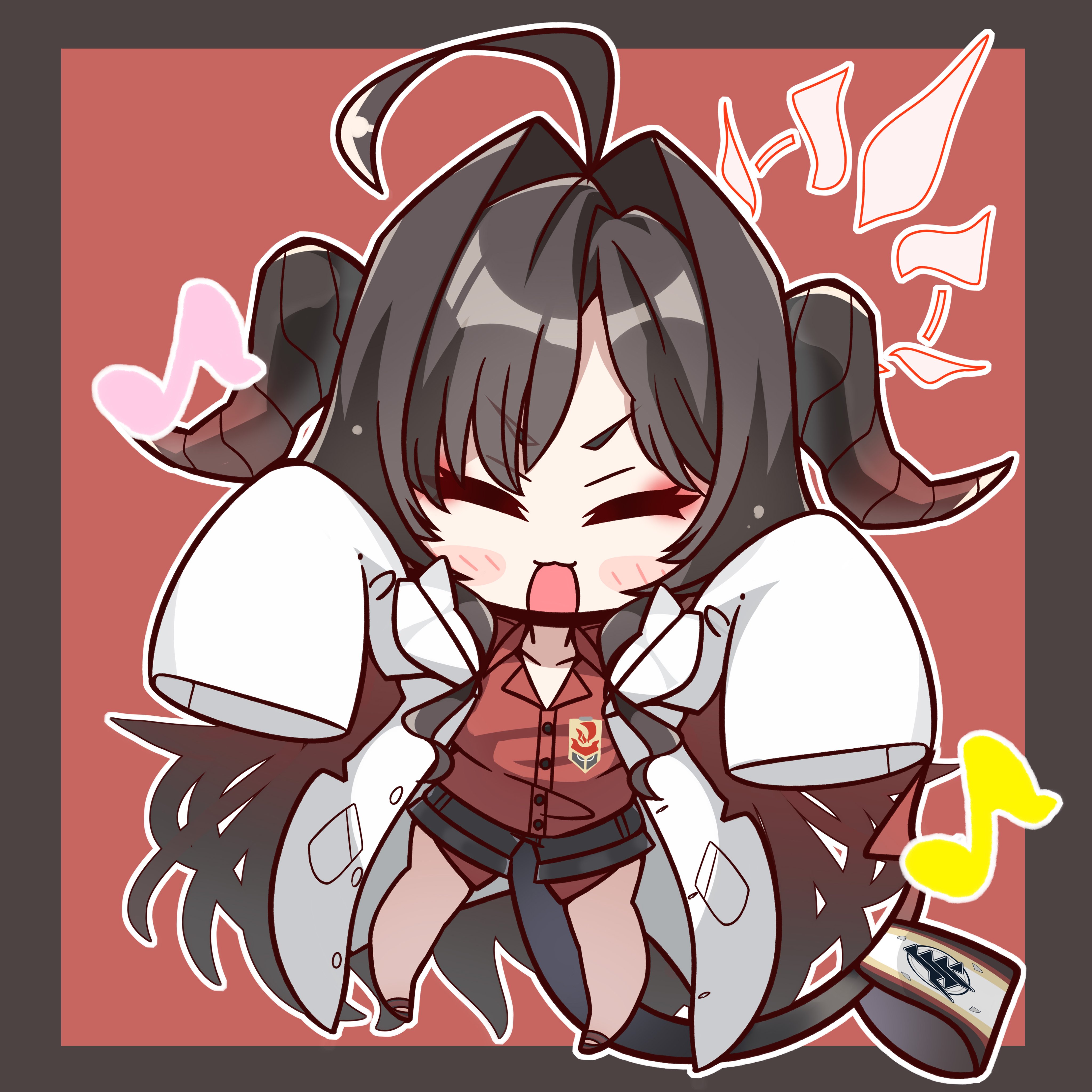:31boy1girlahogeblack shortsblush stickersborderbrown borderbrown hairchibichibi onlyclosed eyescoatcollared shirtcurved hornsdemon girldemon hornsdemon tailfacing viewerfull bodygehenna academy logohair between eyeshair intakeshalohornshuge ahogelab coatlong hairmusical notenckak9rjjdjff4eopen clothesopen coatopen mouthoutlineoutside borderred backgroundred halored shirtshirtshortssimple backgroundsleeves past fingerssleeves past wristssmilesolostandingtailthick eyebrowsv-shaped eyebrowsvery long hairwhite coatwhite outlinewide sleeves