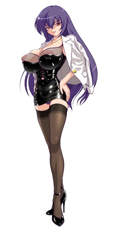 blazerbreastshands on own hipshigh heelshuge breastsjacketjewelrylatexlong hairnecklacenipplespantiespantyshotpurple hairskirtsolostandingthighhighsunderwear