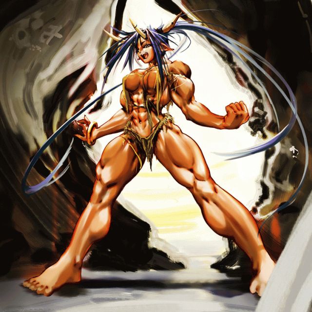 1girlbarefootblue hairdemon girlfeetfemale focushornsmuscularmuscular femaleonipointy earssolo