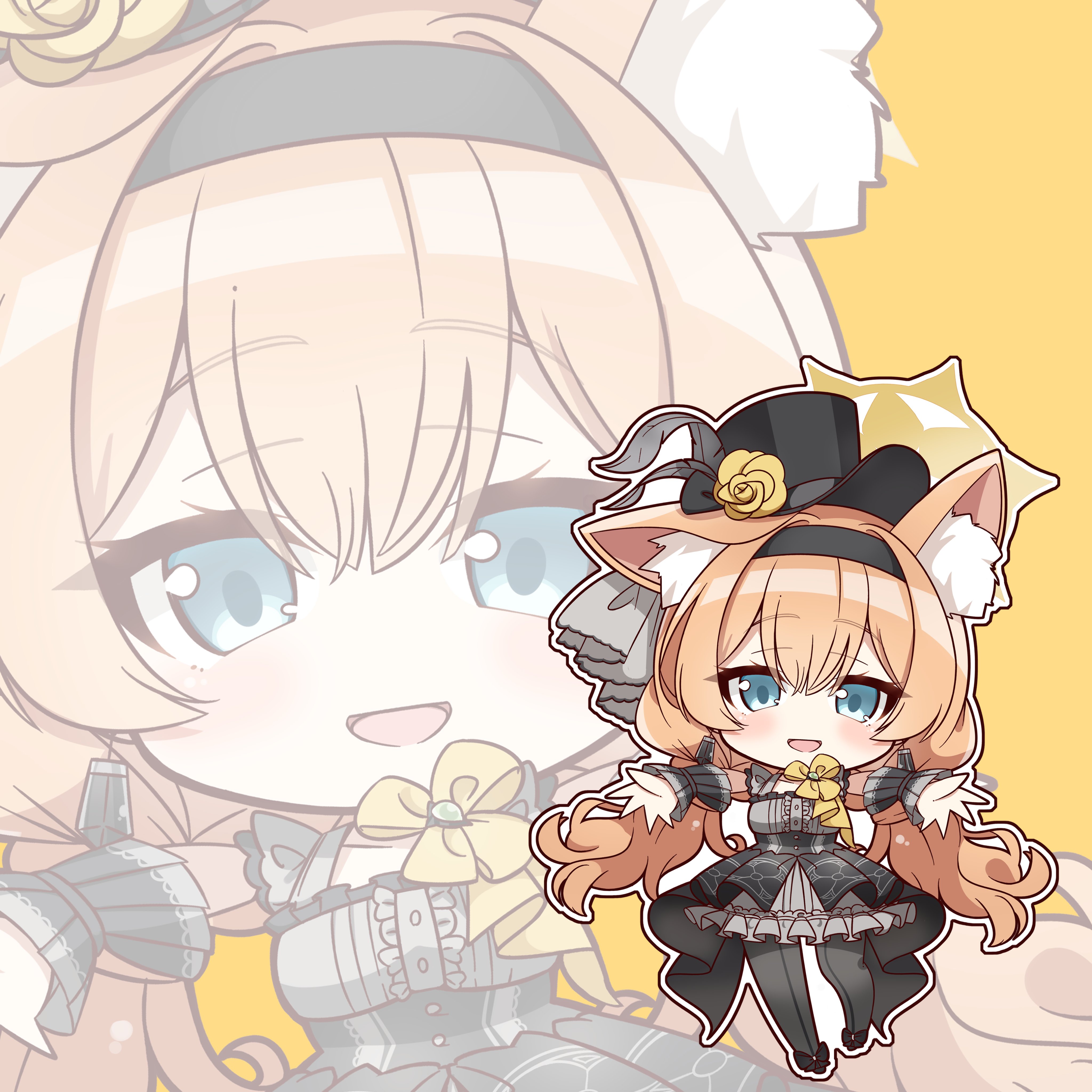 :d1girlanimal ear fluffanimal earsblack dressblack hairbandblack hatblack pantyhoseblack wrist cuffsblue eyesblushcat earscat girlcenter frillschibichibi onlydressearringsextra earsflowerfrilled dressfrillsfull bodygrey dresshair between eyeshairbandhalohathat featherhat floweridolidol clothesjewelrylong hairlooking at viewerlow twintailsmedium dressnckak9rjjdjff4eofficial alternate costumeofficial alternate hairstyleopen mouthorange backgroundorange hairoutlineoutstretched armsoutstretched handpantyhoserosesmilesolostandingstriped clothesstriped pantyhosetop hattwintailstwo-tone dressvertical-striped clothesvertical-striped pantyhosevery long hairwhite outlinewrist cuffsyellow floweryellow haloyellow rosezoom layer