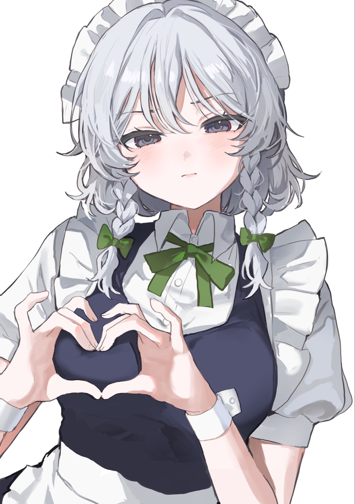 1boy1girlapronblue dressbowbraidbraided sidelockclosed mouthdressgreen bowgreen ribbongrey hairhair bowheartheart handsheart-shaped boob challengelooking at viewermaidmaid apronmaid headdressneck ribbonpinafore dresspuffy short sleevespuffy sleevesribbonshirtshort hairshort sleevessimple backgroundsleevelesssleeveless dresssolotwin braidsupper bodywaist apronwhite apronwhite backgroundwhite shirtwrist cuffs