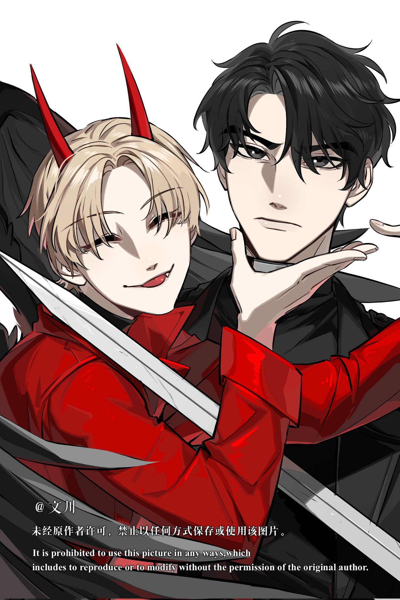 :p1boy2boysblack coatblack hairblack shirtblack wingsblonde haircheon inhoclosed eyesclosed mouthcoatdemon hornsexpressionlessfangfeathered wingshand uphornslooking at viewermale focusmultiple boysnicayukoopen clothesopen coatpopped collarred coatshirtshort hairsword to throattonguetongue outupper bodywings