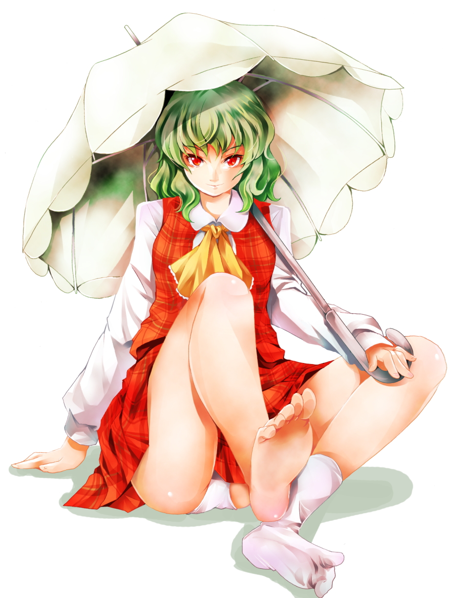 1girlascotbarefootfeetfemale focusfoot focusgreen hairlegspantiespantyshotparasolplaid clothesplaid skirtplaid vestred eyesshort hairsingle socksittingskirtskirt setsockssolessoloumbrellaunderwearupskirtvestwhite pantiesyellow ascot