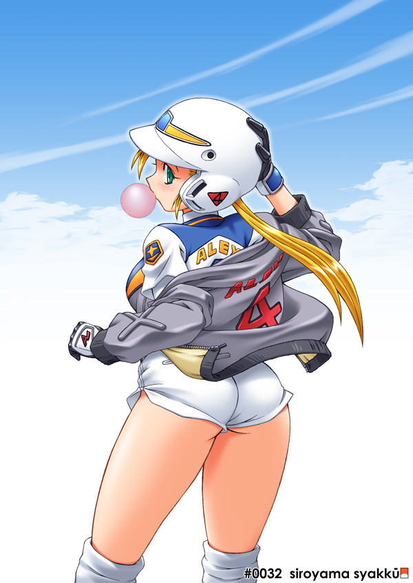 1girlassblonde hairblowing bubble gumblowing bubbleschewing gumfemale focusgloveshelmetjacketponytailsolo