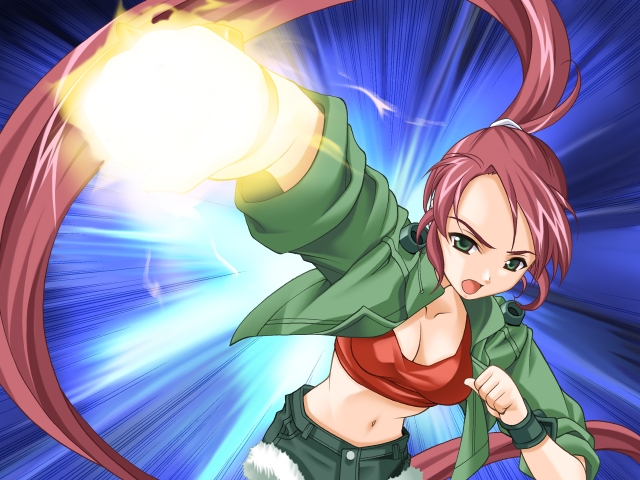 1girlbrown hairdenimdenim shortsenergy ballfemale focusgreen eyeslight orblong hairponytailshortssolo