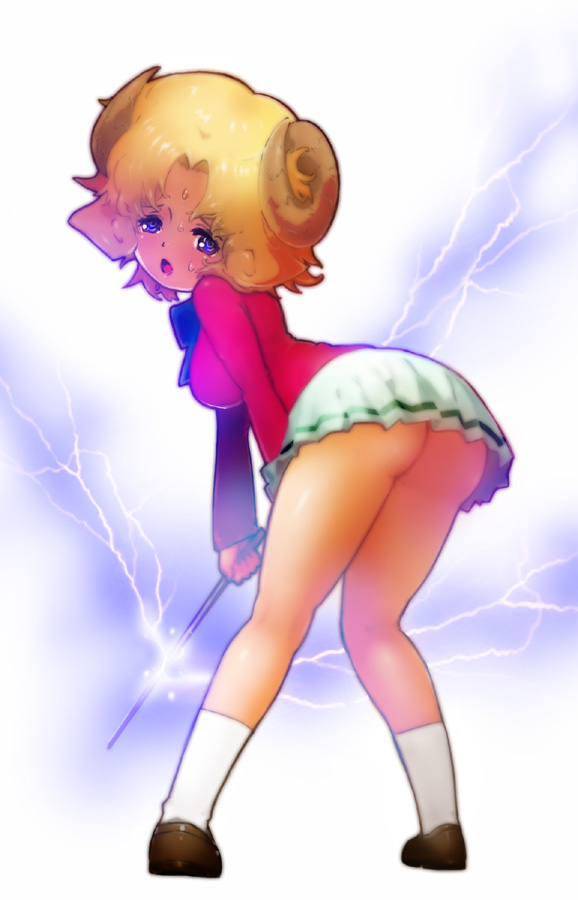 00s1girlassbent overblazerblonde hairblue eyesbreastsdemon girlelectricityfemale focusfrom behindfull bodyhornsjacketkneepitslooking backno pantiesopen mouthpointerschool uniformshort hairskirtsockssolosweatupskirt