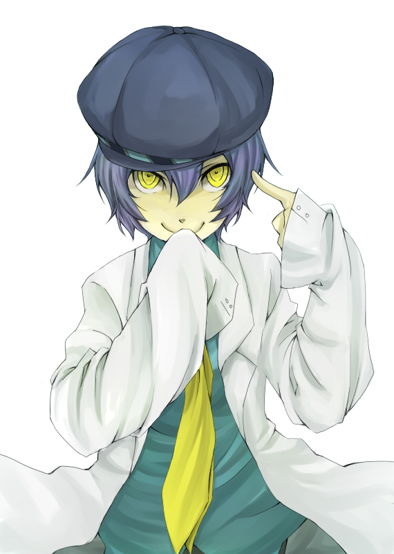 1girlandrogynousfemale focushatlab coatlong sleevesnewsboy capoversized clothesreverse trapsmilesoloyellow eyes