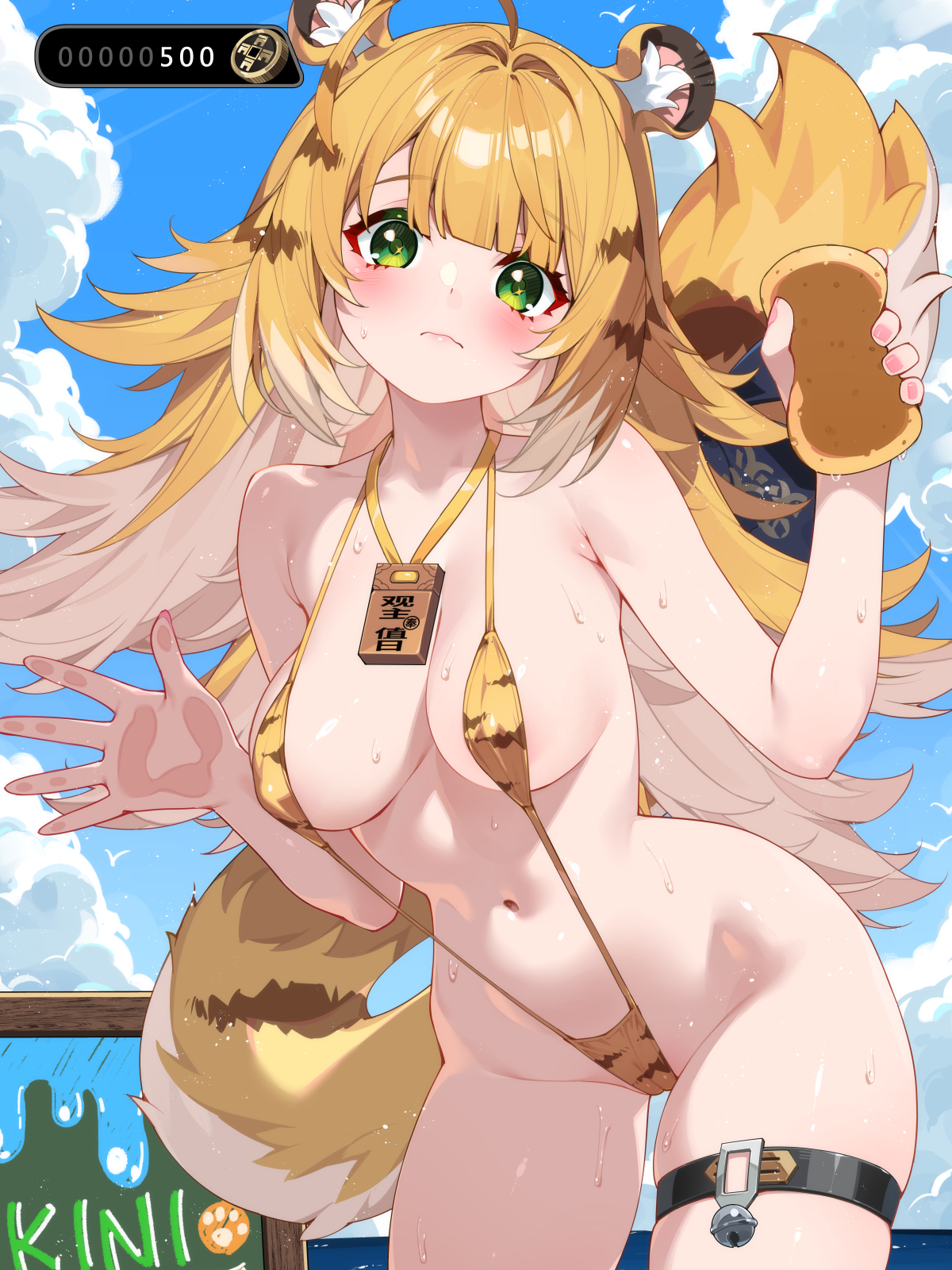 1girlagainst fourth wallagainst glassahogealternate costumeanimal ear fluffanimal earsbellblonde hairblushbreastscameltoeclosed mouthcolored inner haircovered erect nipplesgreen eyeshand on glassholdingholding spongelong hairlooking at viewermedium breastsmulticolored hairnavelskindentationslingshot swimsuitsolospongestandingstriped hairswimsuittailthigh straptiger earstiger girltiger stripestiger tailwetyellow slingshot swimsuit