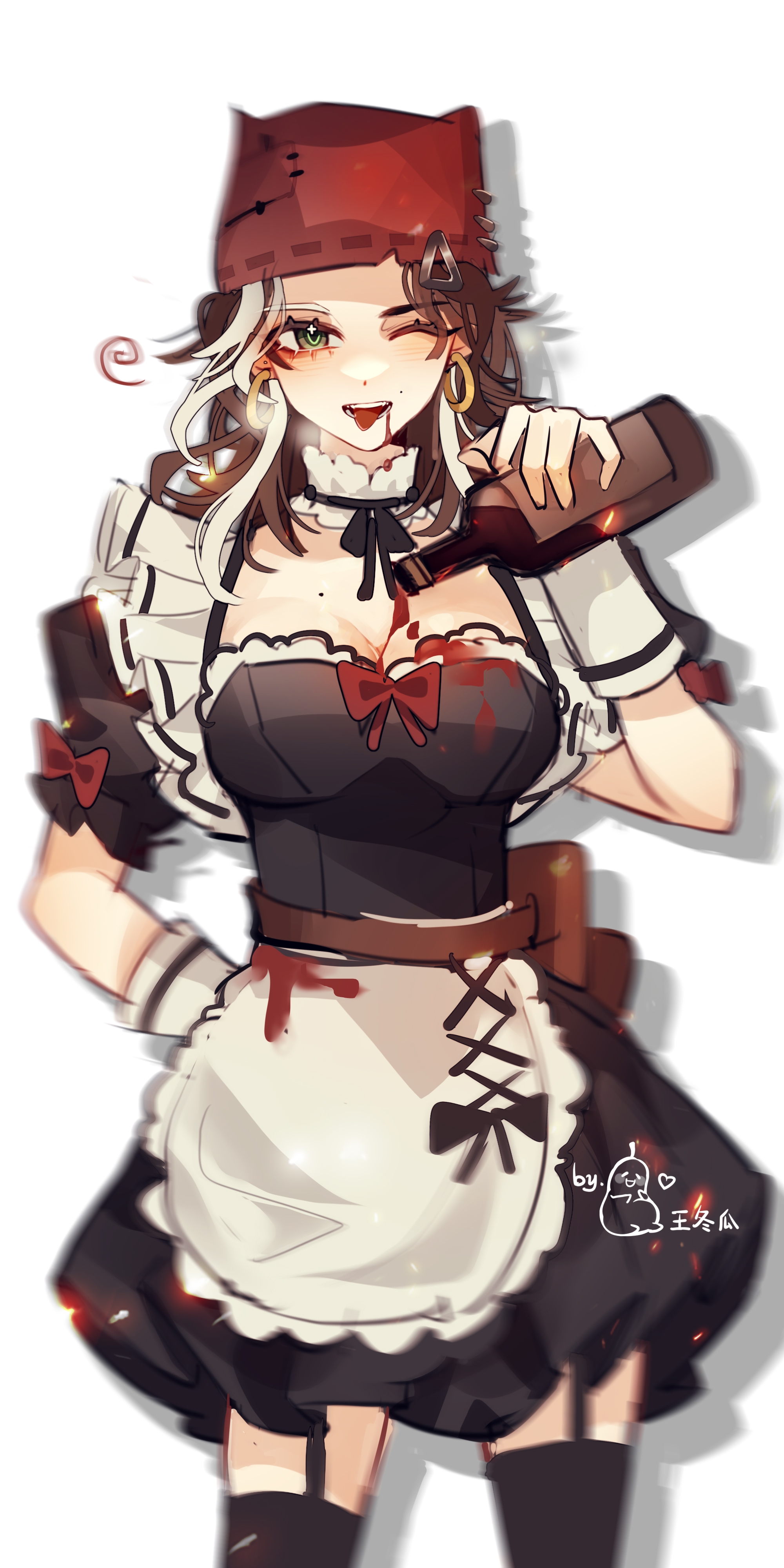 1girlapronblack dressblack thighhighsblushbottlebowbreastsbrown haircleavagedressearringsgarter strapsgreen eyeshatholdingholding bottlehua-nianjewelrylarge breastslong hairlooking at viewermaidmaid apronmedium breastsmolemole on breastmulticolored hairone eye closedopen mouthpuffy sleevesribbonshort sleevessmilesolostreaked hairthighhighstonguewhite backgroundwrist cuffs