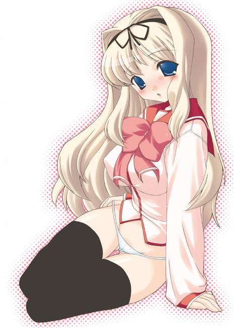 00s1girlblonde hairblue eyesblushbreastscovered erect nipplesfemale focuslarge breastslong hairpantiesribbonschool uniformsolothighhighsunderwear