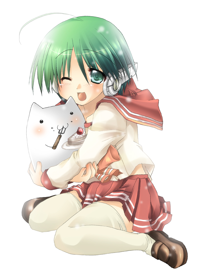 cakecatfoodgreen eyesgreen hairone eye closedpastryrobot earsschool uniformshort hairskirtthighhighswink