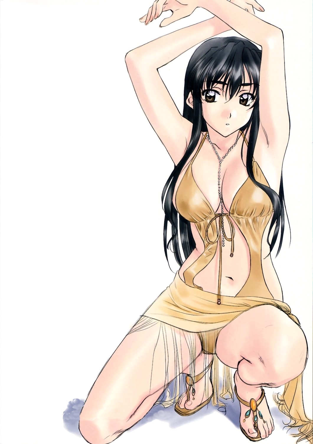 1990s (style)1girlarmpitsarms upblack hairbreastsbrown eyescleavagefeetfemale focushair downjewelrylarge breastslong hairnecklaceretro artstylesandalssolo