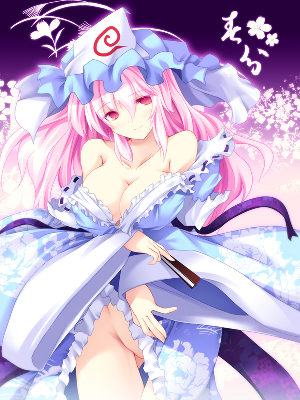 1girlbreastscleavagedressfemale focushatjapanese clotheskimonolarge breastslong hairno pantiespink eyespink hairsolo