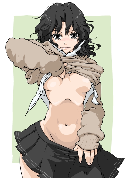 1girlareola slipblack eyesblack hairbreastsclothes liftclothes pullcurly hairfemale focuslifting own clothesmidriffminiskirtnavelpleated skirtschool uniformshirt liftshort hairskirtskirt pullsmilesolosweaterunderboobundressingwavy hair