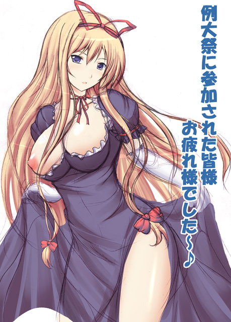 1girlblonde hairblushbreast slipbreastselbow glovesfemale focusgloveshair ribbonlarge breastslegslong hairnipplesone breast outribbonside slitsolothighswhite gloves
