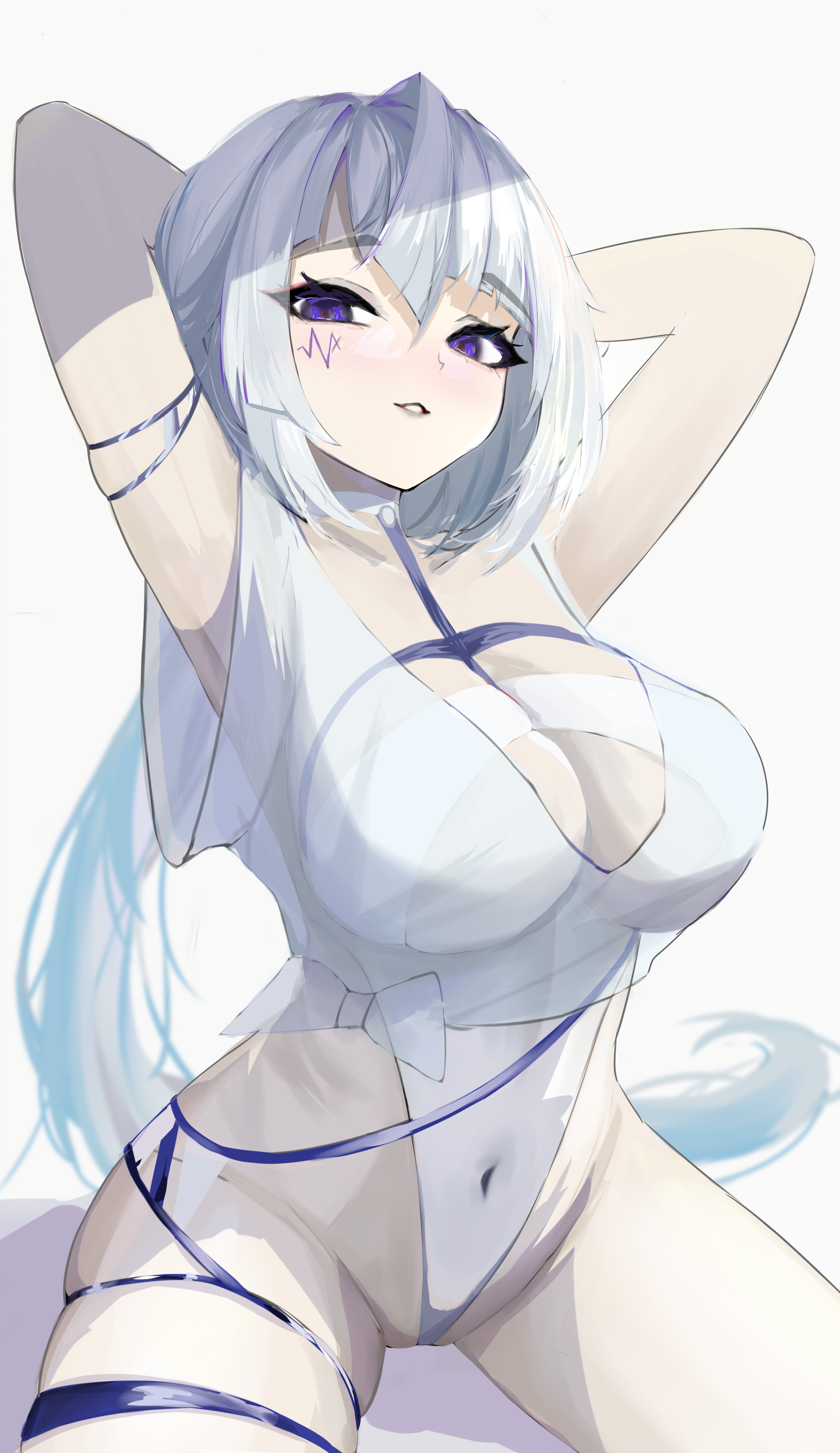 1girlarmletarmpitsarms behind headasymmetrical bangsasymmetrical hairblue eyesbowbreastschokercleavagecollarbonefacial markgluteal foldhands uphighlegjewelrylarge breastslegs apartlong hairlooking at viewernavelon floorparted lipsrevealing clothessidelockssimple backgroundsittingsmilesoloteeththick thighsthigh strapthighswhite backgroundwhite hairye he yue