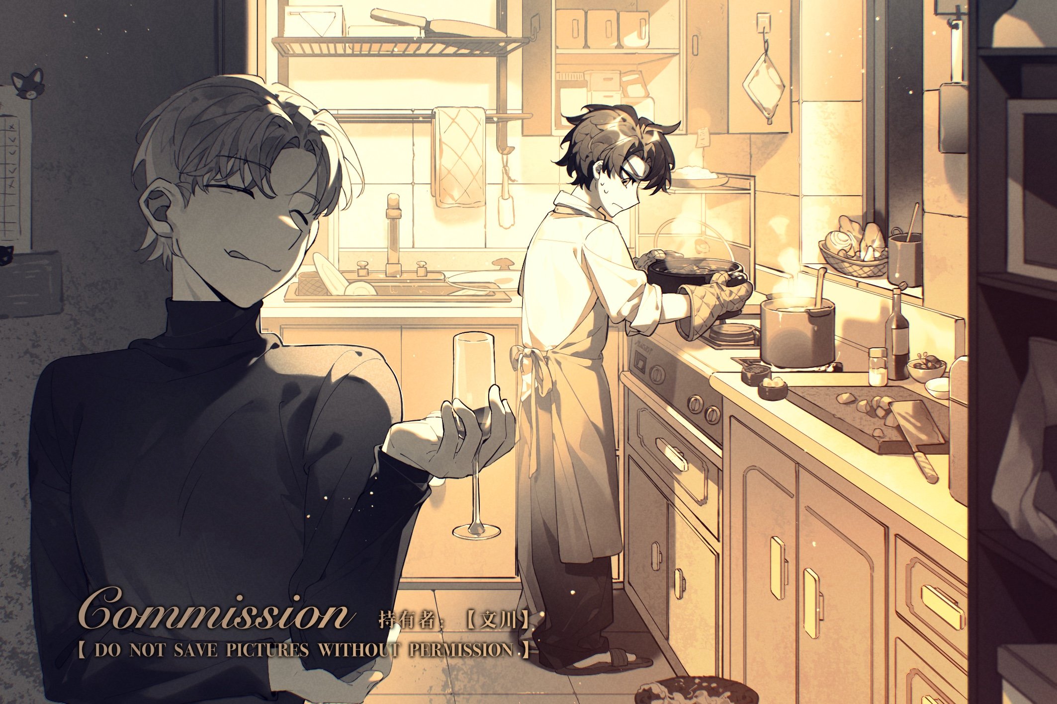 2boysapronblack hairblack shirtblonde haircabinetcheon inhocleaverclosed eyescoatcrew neckcupcutting boardfrying panfull bodyhand on own elbowholdingholding cupindoorskitchenmale focusmittensmultiple boysnicayukoplatepopped collarsepiaseriousshirtshort hairsinksittingsleeves rolled upsweatdroptile floortileswhite apronwhite coatwok