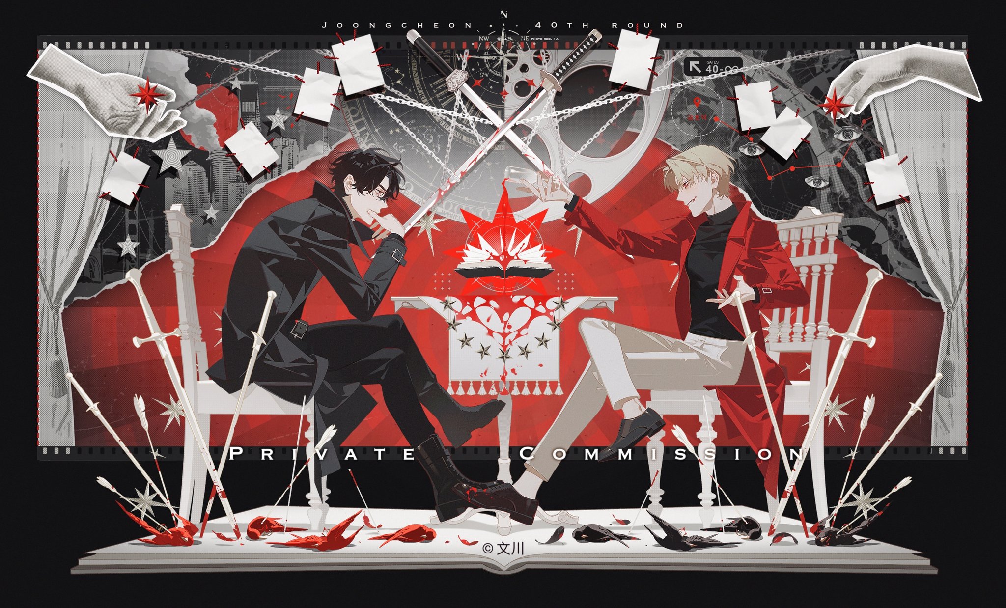 2boysarrow (projectile)big dipperblack borderblack coatblack hairblack shirtblonde hairbloodblood splatterbloody weaponbookborderchainchaircheon inhocitycoatcompassconstellation printcrew neckcrossed legscrossed swordscupdisembodied handelbow on kneefalling feathersfeathersfrom sidefull bodygearshand on own chinholdingholding cuplooking at anothermale focusmultiple boysnicayukoopen bookopen clothesopen coatout of frameoutstretched handplantedplanted swordplanted weaponpopped collarred coatred eyesscabbardsheathshirtshort hairsittingskylineslouchingsmilesparkleswordtabletoo many weaponstorn paperweapon
