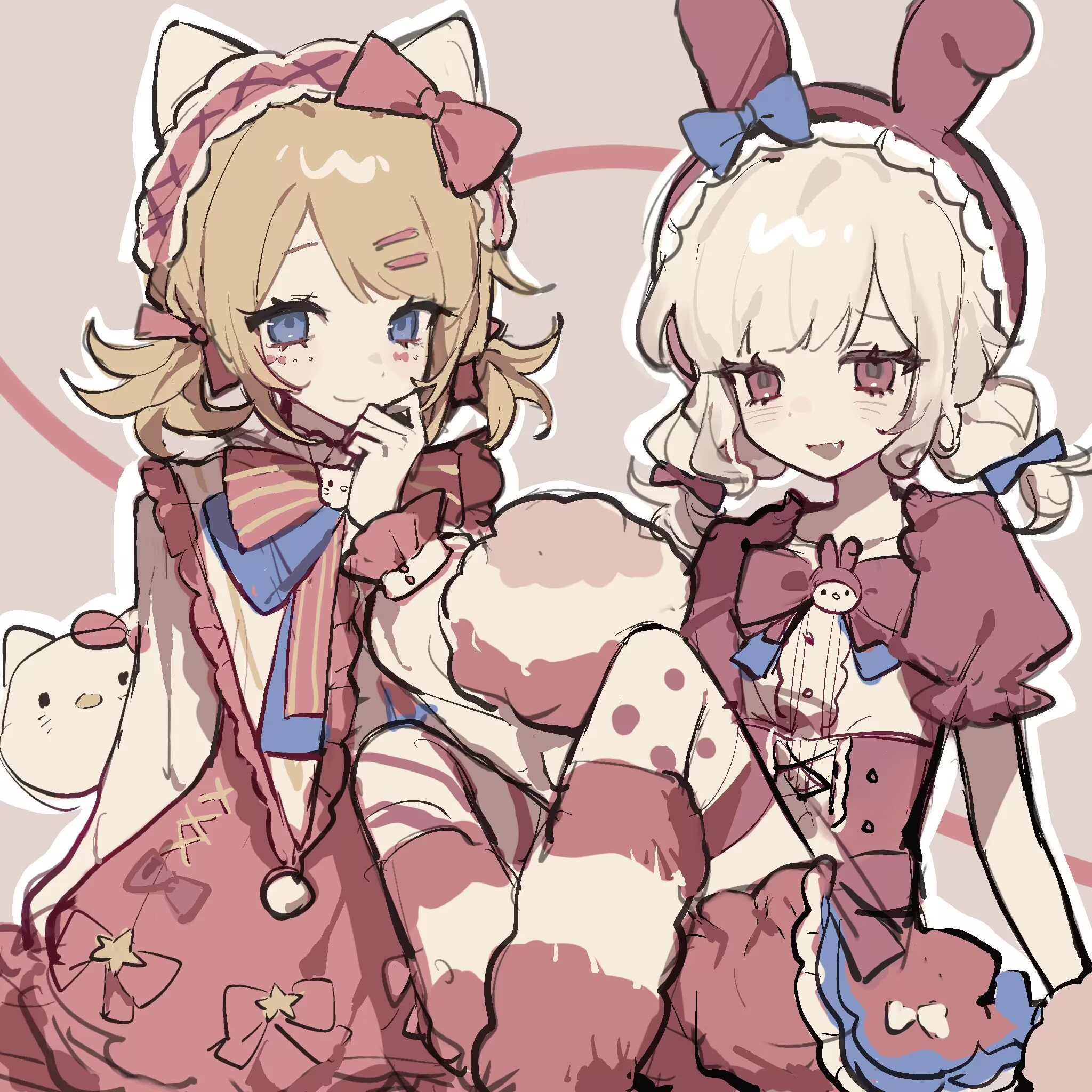 2girlsanimal earsanimal handsblonde hairblue bowblue eyesblushbowbowtiecat earsclosed mouthdressfake animal earsfangfluffy legwearfrillsgloveshair bowhair ornamenthairclipleg warmerslong hairlong sleeveslooking at viewerlow twintailsmultiple girlsopen mouthpink bowpink dresspink eyespolka dotpom pom (cheerleading)puffy short sleevespuffy sleevesrabbit earsred bowshangxindelucha6026shirtshort hairshort sleevesshort twintailssittingsketchskirtsmilesocksstriped clothesthighhighstwintailswhite shirt