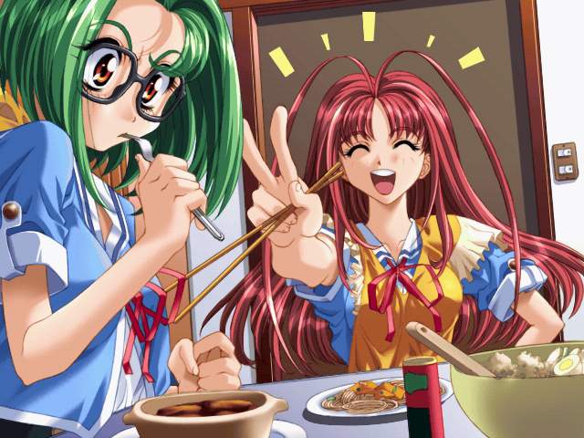 ikeda katsuma, shibahime tsubasa, kareshi kanojo no jijou, official art, 1990s (style), blonde hair, brother and sister, earbuds, earphones, green eyes, headphones, shared earphones, siblings