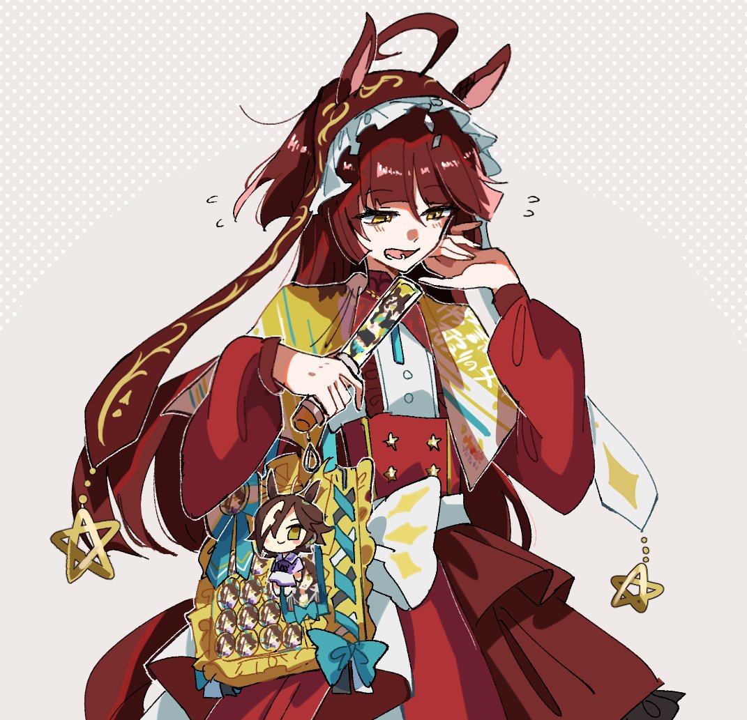 1girlahogeanimal earsbagbag charmblunt bangsblunt endsblushbowbowtiebrown hairbrown headdresscharacter charmcharm (object)dresshairbandhorse earshorse girlhorse taillong hairlong sleevesmulticolored hairopen mouthpinpurple bowpurple bowtiepurple shirtred desire (umamusume)red dressred hairred hairbandred headdresssailor collarsailor shirtschool uniformshirtshoulder bagsimple backgroundskirtsolostar (symbol)star ornamentstreaked hairtailtracen school uniformwhite hairwhite sailor collarwhite skirtyellow eyes