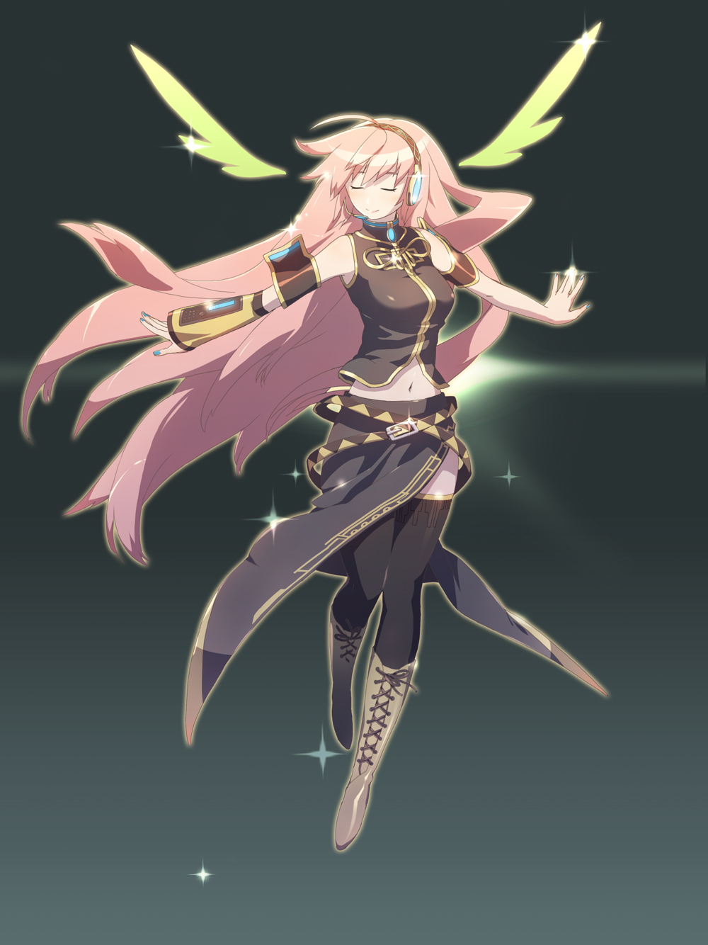 1girlarmbandarmletbeltblack thighhighsblue nailsbootsclosed eyesfemale focushead wingsheadphonesheadsetjewelryknee bootslong hairlong skirtmidriffnail polishnavelpink hairside slitskirtsolostar (symbol)thighhighswings