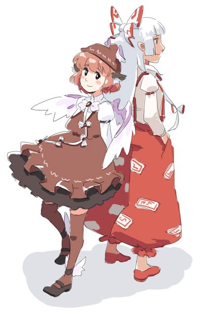 2girlsanimal earsarms behind backback-to-backbowdressfemale focushair bowhand in pocketlong hairmultiple girlspink hairprofileshoesshort hairsimple backgroundstandingthighhighswhite hairwingszettai ryouiki
