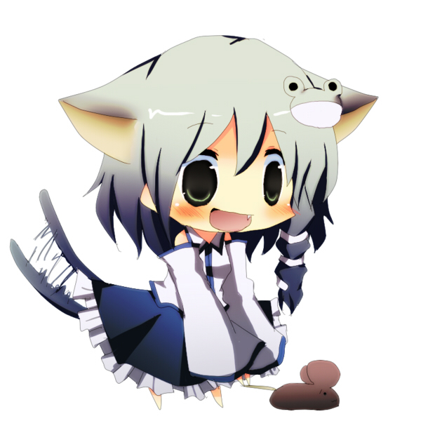 1girlalternate hair coloranimal earsblushcat earscat girlcat tailchibifangfemale focusgradient hairgreen eyeshappykemonomimi modemouse (animal)multicolored hairopen mouthpurple hairsimple backgroundsolotailtail wagging