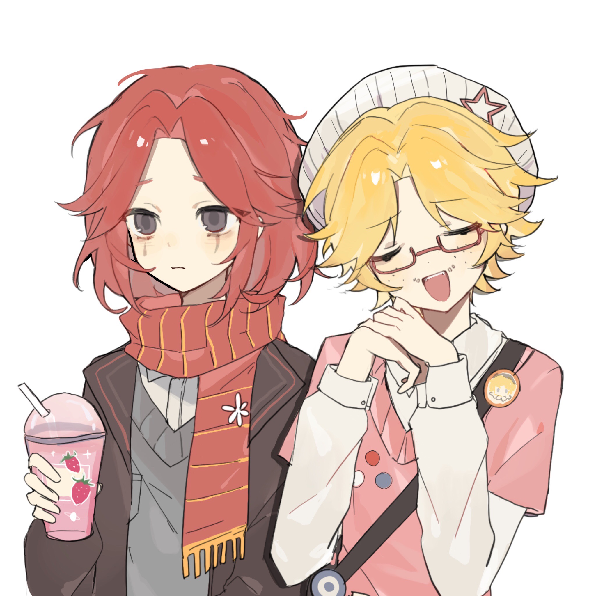 2boysbadgeblack eyesblack jacketblonde hairblushbutton badgeclosed eyesclosed mouthcollared shirtcupdisposable cupfoodfruitglassesgrey eyeshands uphatholdingholding cupjacketlayered sleeveslong sleevesmale focusmultiple boysofficial alternate costumeopen clothesopen jacketopen mouthown hands togetherparted bangspink shirtred hairred scarfred-framed eyewearscarfsemi-rimless eyewearshangxindelucha6026shirtshort hairshort over long sleevesshort sleevessimple backgroundsmilestar (symbol)stitched mouthstitchesstrawberrystriped clothessweatersweater vestteethunder-rim eyewearupper bodyvestwhite backgroundwhite shirt