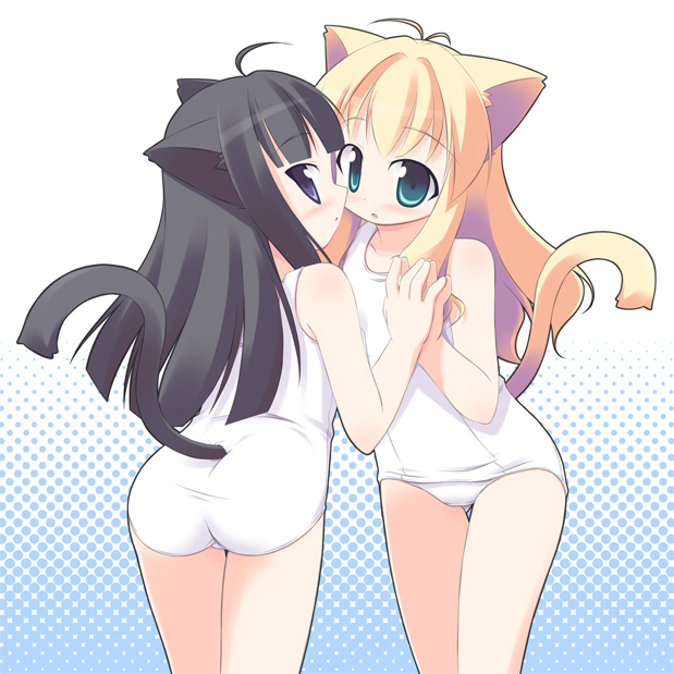 ahogeanimal earsantenna hairassblack hairblonde hairblue eyesblushcat earscat tailchildgreen eyeslong hairone-piece swimsuitschool swimsuitswimsuittailwhite one-piece swimsuitwhite school swimsuit