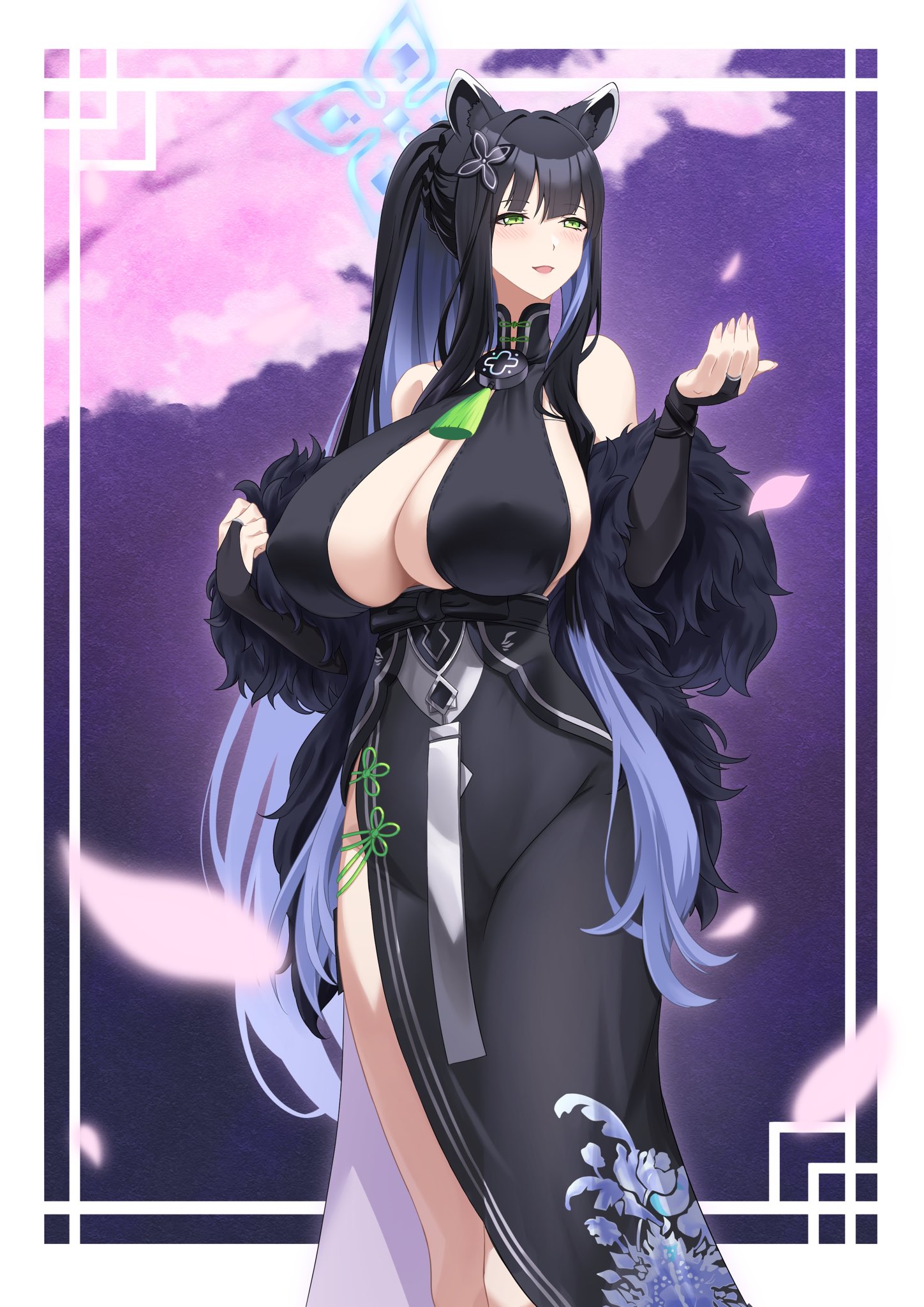 1girlanimal earsblack dressblack glovesblack hairblue hairblue haloblushbreastsbridal gauntletscherry blossomschina dresschinese clothescleavagecolored inner haircovered erect nipplescurvydressfalling petalsfeet out of frameflower knotfur trimglovesgreen eyeshair ornamenthalolarge breastslong hairmulticolored hairneck tasselopen mouthoutside borderpetalsside slitsidelockssleevelesssleeveless dresssmilesolostandingtasseltiger earstiger girltwo-tone hair